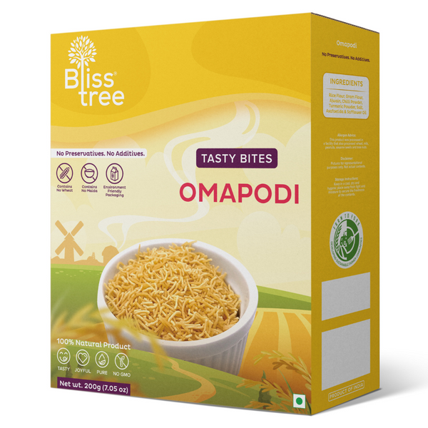 Seasoned with Ajwain, Chili Powder, Turmeric Powder, and a hint of salt before being deep-fried. Bliss Tree's Omapodi is a flavourful, crunchy, light, and healthy traditional Indian snack.