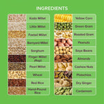 Ingredients: Kodo Millet, Little Millet, Foxtail Millet, Barnyard Millet, Sorghum, Finger Millet (Ragi), Pearl Millet, Wheat, Red Rice, Hand-Pound Rice, Yellow Corn, Green Gram, Roasted Gram, Peanuts, Soya Beans, Almonds, Cashew Nuts, Pistachios, Dry Ginger and Cardamom.