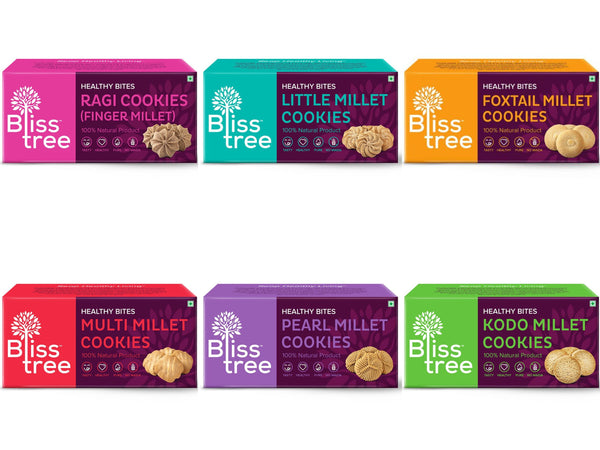 6 packs contains 1 x Foxtail Cookies, 1 x Kodo Cookies, 1 x Little Cookies, 1 x Multi-Millet Cookies, 1 x Ragi Cookies and 1 x Pearl Cookies (75g each)
